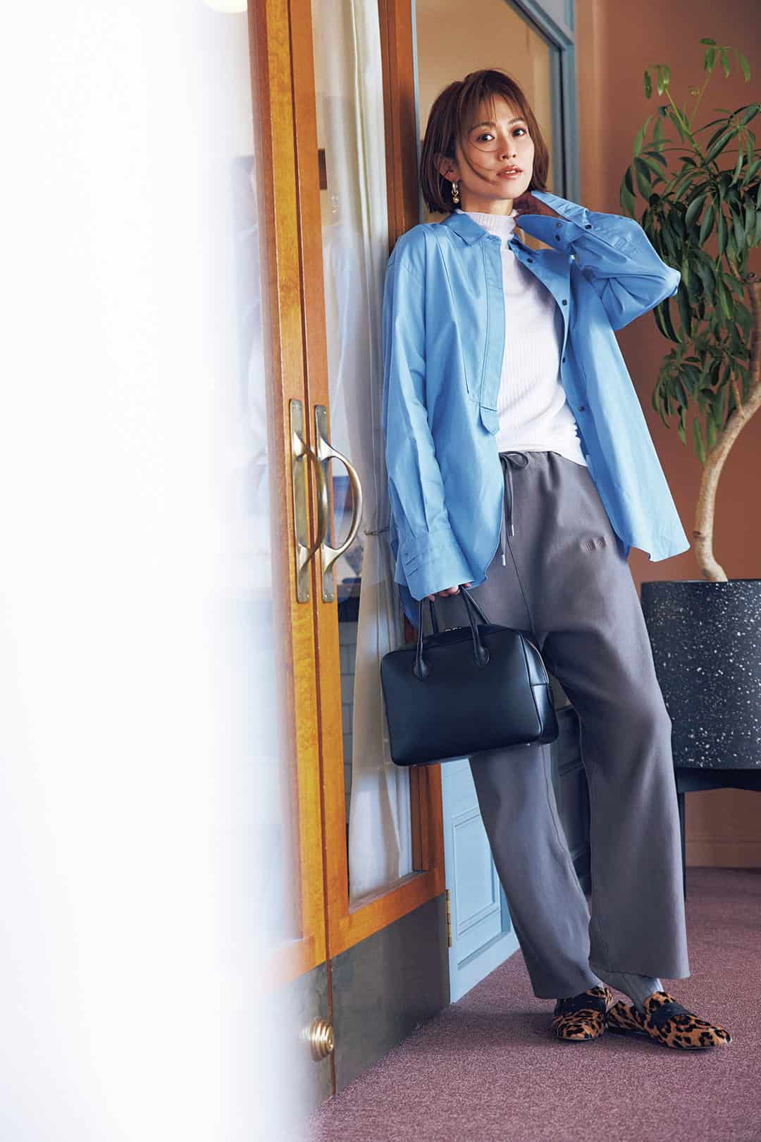 パンツ¥25,300(カオス/カオス丸の内)シャツ※参考商品(デパリエ)シアータートルニット¥28,600(マルティニーク/マルティニーク ルコント ルミネ有楽町)バッグ¥86,900(メゾンカナウ/ヤマニ)ソックス¥3,520(パンセレラ/真下商事)シューズ¥79,200(ブレンテッラ/ロンハーマン)ピアス¥119,900(アグメス/ショールーム ロイト)