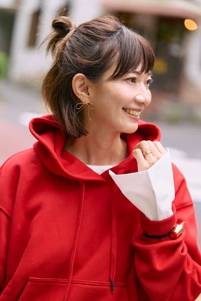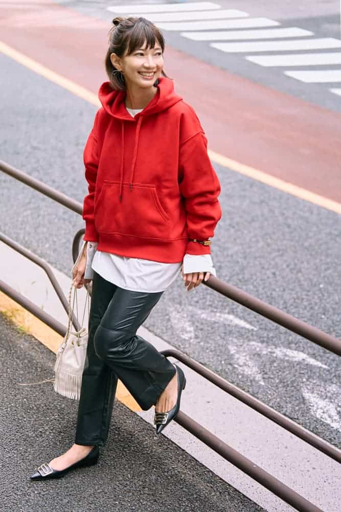 秋冬になると着たくなるのが赤アイテム。季節感を意識して、ボトムスはレザーパンツをセレクトしました。トップスはあえてLサイズでゆったりと着て、シャツレイヤードで立体感を。存在感のある赤×レザーの組み合わせも、シャツの白が程よくトーンをやわらげてくれます。ボトムスは細身のフレアシルエットでバランスを取り、足元とジュエリーはゴールドで統一して上品さをキープ。仕上げにハーフアップのお団子ヘアで抜け感をプラスして、大人カジュアルにまとめました。