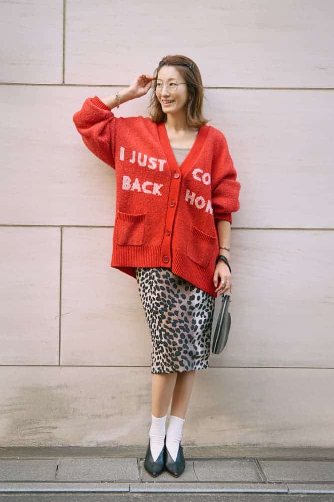 去年のクリスマスに迎えた赤カーディガン。今季はトレンドのレオパード柄を合わせて、ぐっと今年顔にアップデートしました。黒×赤の強いコントラストは少しハードに感じることもありますが、淡いトーンや柄を取り入れることで、赤をやわらかく着こなせます。小物は黒で統一し、全体をキュッと引き締めて。ハート形のバッグをアクセントに添えました。赤に負けない存在感のアイテムを合わせれば、マンネリコーデも一新。大人の赤アイテムは、色使いや組み合わせ次第で印象が変わるからこそ、その日の予定や気分に合わせて楽しみたいです。