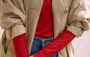 鮮やかな赤のトップスは、それだけで主役級の存在感。合わせるアイテムはクラシカルに、トレンチやローファーを合わせてトラッドにまとめるのが私流です。インパクトのある赤は、黒や白と合わせるとコントラストが強く出すぎてしまうことも…。ベージュやデニムのブルーなど、アースカラーを選ぶとぐっとこなれた印象に。トレンチから赤の見える分量を調節して、”差し色として楽しむ”大人のトラッドコーデに仕上げました。