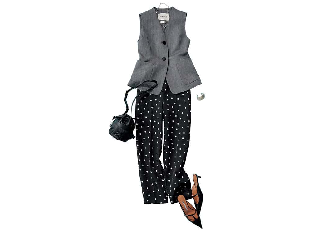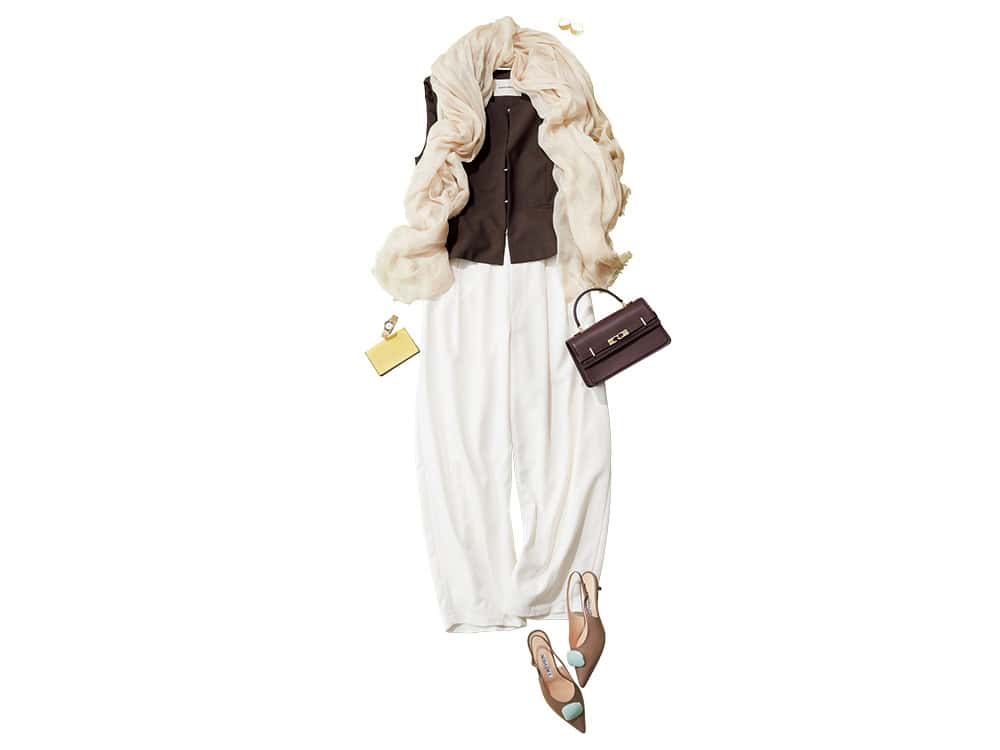 (参考コーデ1)パンプス¥33,000(ツル バイ マリコ オイカワ)ベスト×ストール[セット販売]¥17,930(アダム エ ロペ/ジュンカスタマーセンター)パンツ¥33,000(ウィム ガゼット/ウィム ガゼット 玉川髙島屋S・C店)バッグ¥157,300(J&M デヴィッドソン/J&M デヴィッドソン カスタマーセンター)ピアス¥33,000(ebiki/ロードス)(参考コーデ2)ミュール¥69,300(ペリーコ/アマン)ジレ¥66,000※10月発売予定(デパリエ/デパリエ 伊勢丹新宿店)パンツ¥33,000(エストネーション)バッグ¥126,500(J&M デヴィッドソン/J&M デヴィッドソン カスタマーセンター)ネックレス¥66,000(ブランイリス/ブランイリス トーキョー)バングル¥99,000(vv/ロードス)