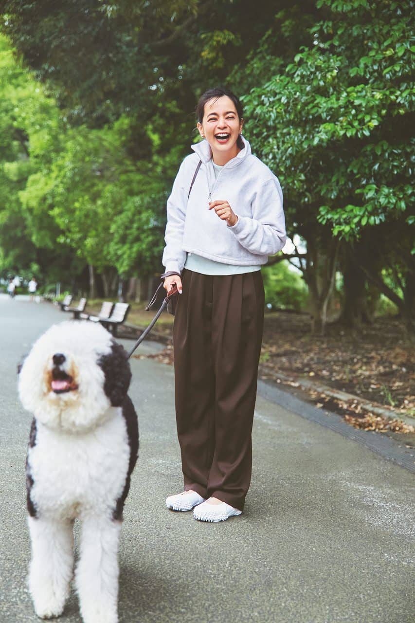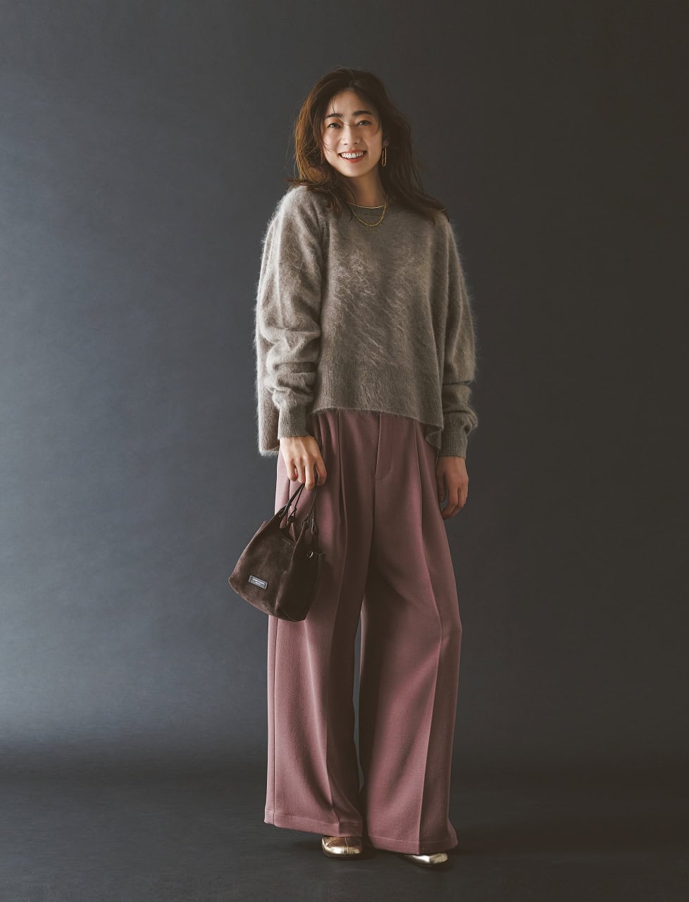 フワッとしたシャギーニットが落ち着いた雰囲気を醸しつつ、同系色のパンツで統一感ある着こなしに。短丈がこなれ感をプラスし、地味見えせずに清楚な印象に仕上がります。ルーズに広がる裾がウエスト周りをカモフラしてくれ、華奢見え効果も。