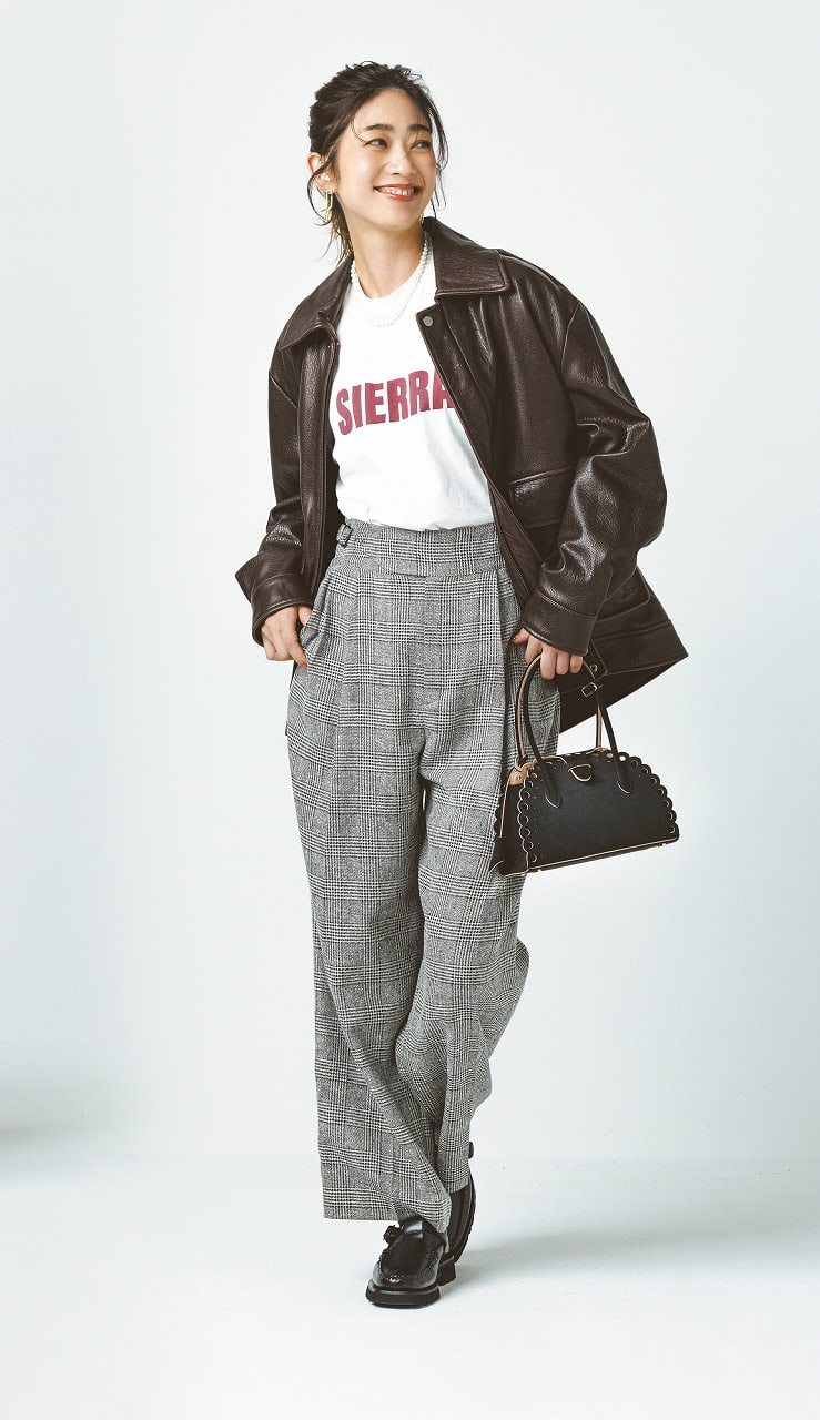 存在感のあるレザージャケットが、シンプルなワンツーコーデを一気に格上げ。柔らかめのブラウンレザーなら重たくならず、カジュアルにもきれいめにも馴染みます。