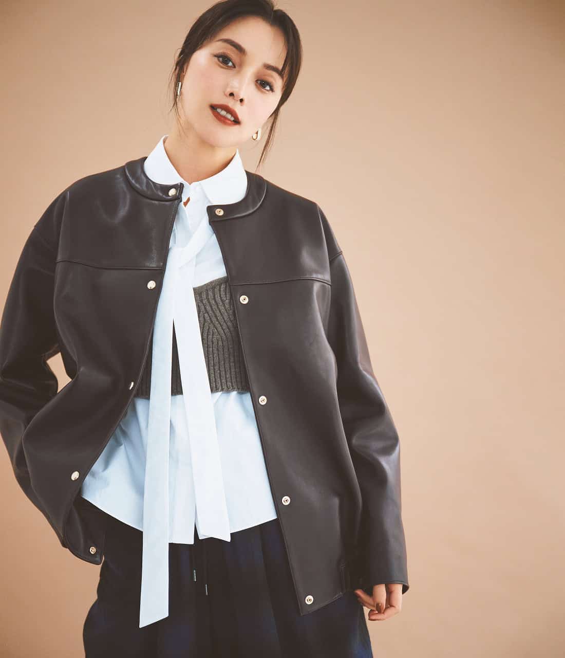 レザージャケット¥429,000シャツ¥64,900(ともにドゥロワー/ドゥロワー 青山店)ビスチェ¥27,500(フィーニー)パンツ¥53,900(サクラ/インターリブ)ピアス¥64,240※参考価格(オーガスト)