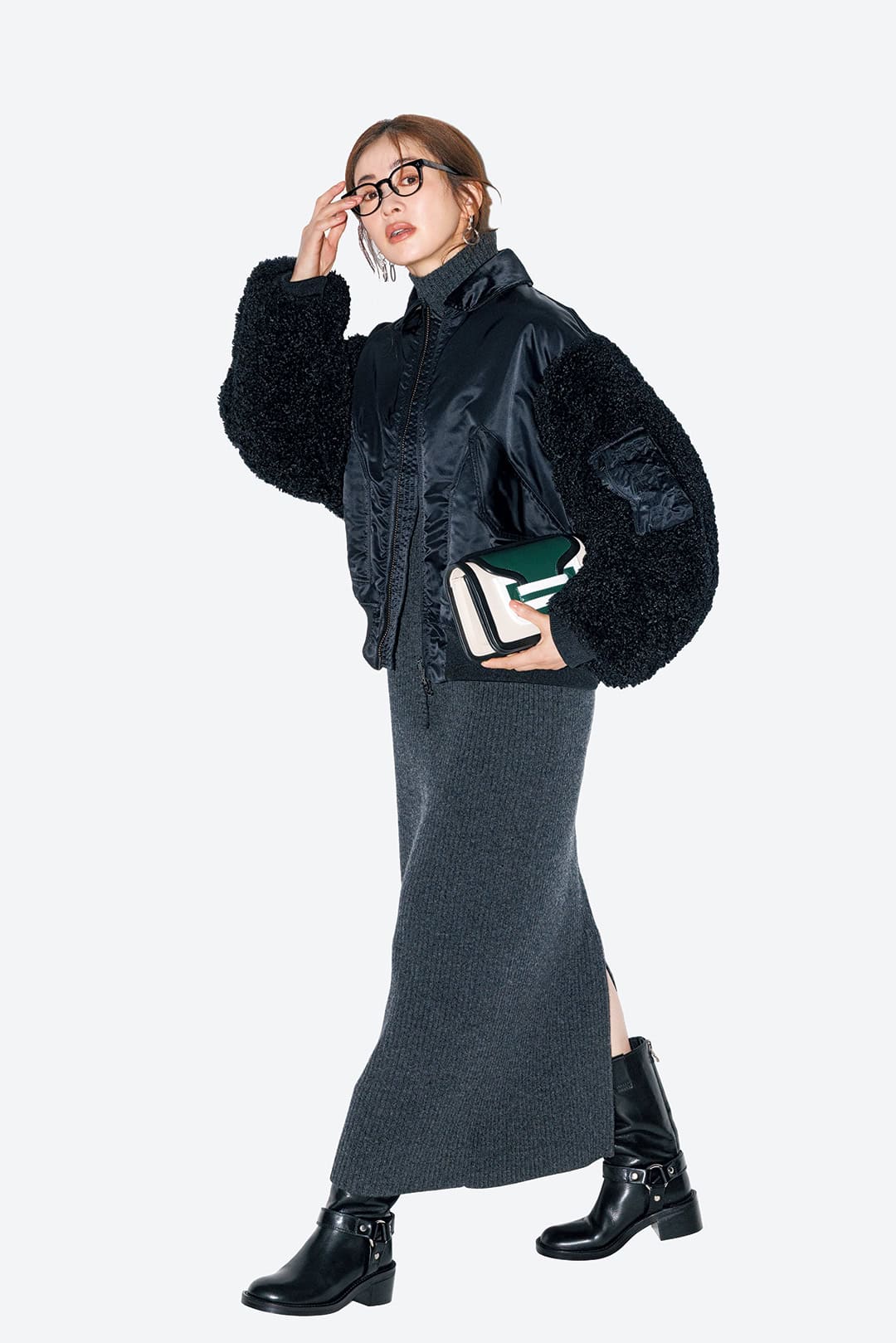 1着でコーデが決まるロングワンピースは、秋冬になるとのっぺりしがちという側面も。ツヤ感のあるナイロン×ボアという個性の異なる素材を配したブルゾンなら、ワントーンコーデに奥行きを出せます。