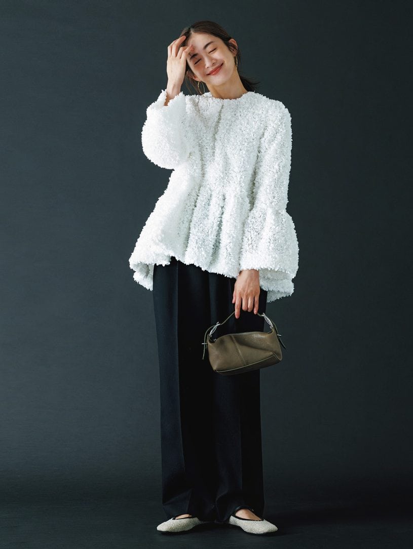 ペプラム×チュールで、トレンド要素が山盛りのデザイン。ふんわりとラインを覆うシルエットで、体型カバーもバッチリです。ボトムスは、黒パンツで引き算するのが最適。モノトーンでパキッと締めて甘ニッシュに仕上げて。