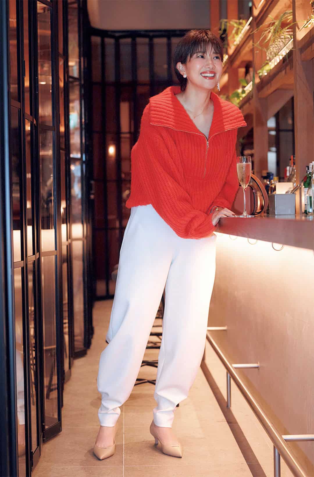パンツ¥29,700(ル フィル)ニット¥49,500(ザ シンゾーン/シンゾーン ルミネ有楽町店)バッグ¥121,000〈ルッツ モリス〉靴¥59,400〈ペリーコ〉(ともにアマン)ピアス¥66,000(カラットアー/イセタンサローネ東京)ネックレス¥33,000(マリハ)リング¥24,200(ココシュニック オンキッチュ/ココシュニック)