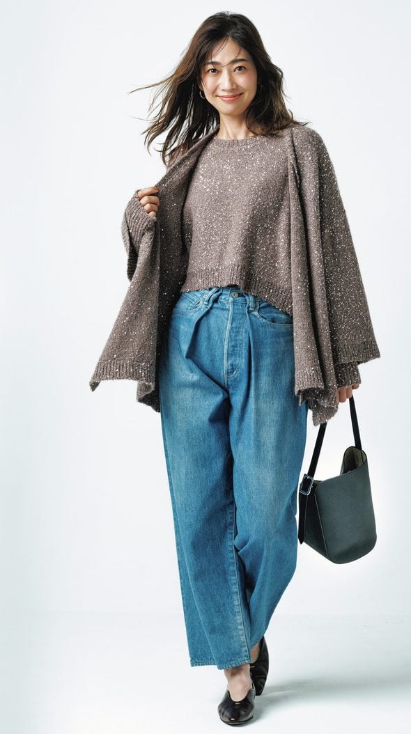優しげなくすみブラウンに、ラメが映える1着。ほどよいキラキラと落ち着いた色味で、どんなアイテムも合わせやすくコンサバ派もハマること間違いなし!いつものデニムコーデを明るく見せてくれます。