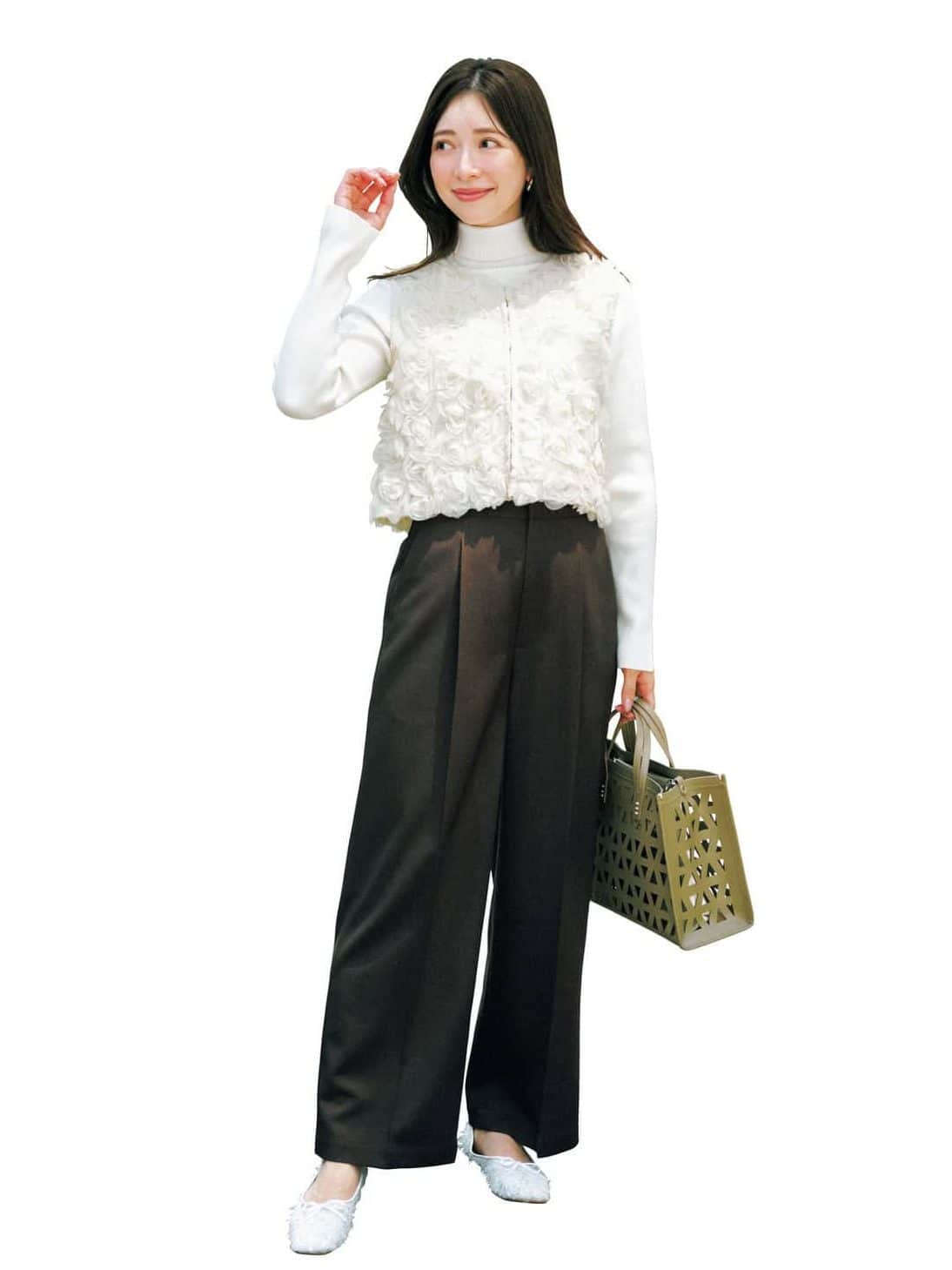 ジレ¥14,500(トラッツォドンナ)ニット¥10,780(カデュネ)パンツ¥22,000(アンクレイヴ/アンクレイヴ〈オンワード樫山〉)シューズ¥16,500(ダイアナ/ダイアナ 銀座本店)ピアス¥47,300(ウノアエレシルバーコレクション/ウノアエレ ジャパン)バッグ/スタイリスト私物