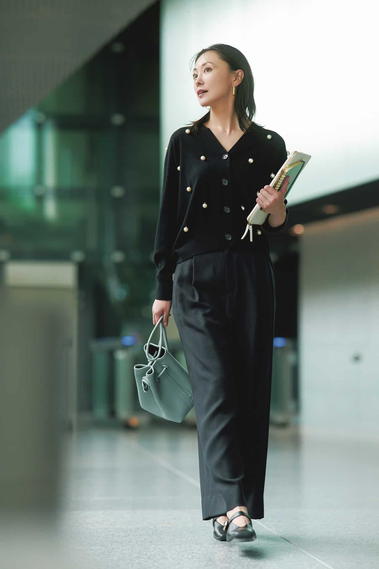 カーディガン[11月発売予定]¥38,500ニット[11月発売予定]¥29,700(ともにカレンソロジー/カレンソロジー 二子玉川)パンツ¥35,200(クロイロ/スタニングルアー 新宿店)バッグ¥151,800(J&M デヴィッドソン/J&M デヴィッドソン カスタマーセンター)パンプス¥16,500(ダイアナ/ダイアナ 銀座本店)イヤリング¥52,800(ヒロタカ/ヒロタカ 表参道ヒルズ)