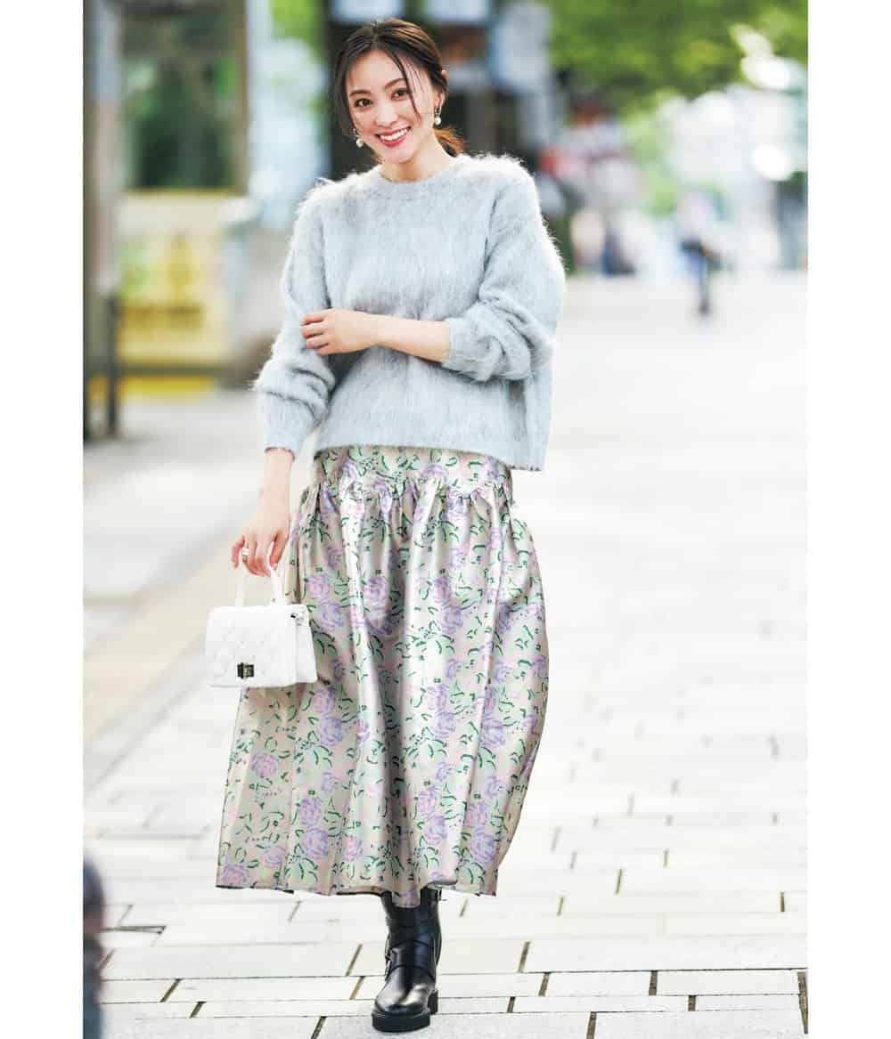 スカート¥29,700(ヌキテパ/パサンド バイ ヌキテパ)ニット¥8,990(アンフィーロ/アンフィーロ〈オンワード樫山〉)バッグ¥16,500シューズ¥29,700(ともにダイアナ/ダイアナ 銀座本店)ピアス¥12,100(カラ・ユ/ショールーム ロイト)リング¥21,450(ココシュニック オンキッチュ/ココシュニック)