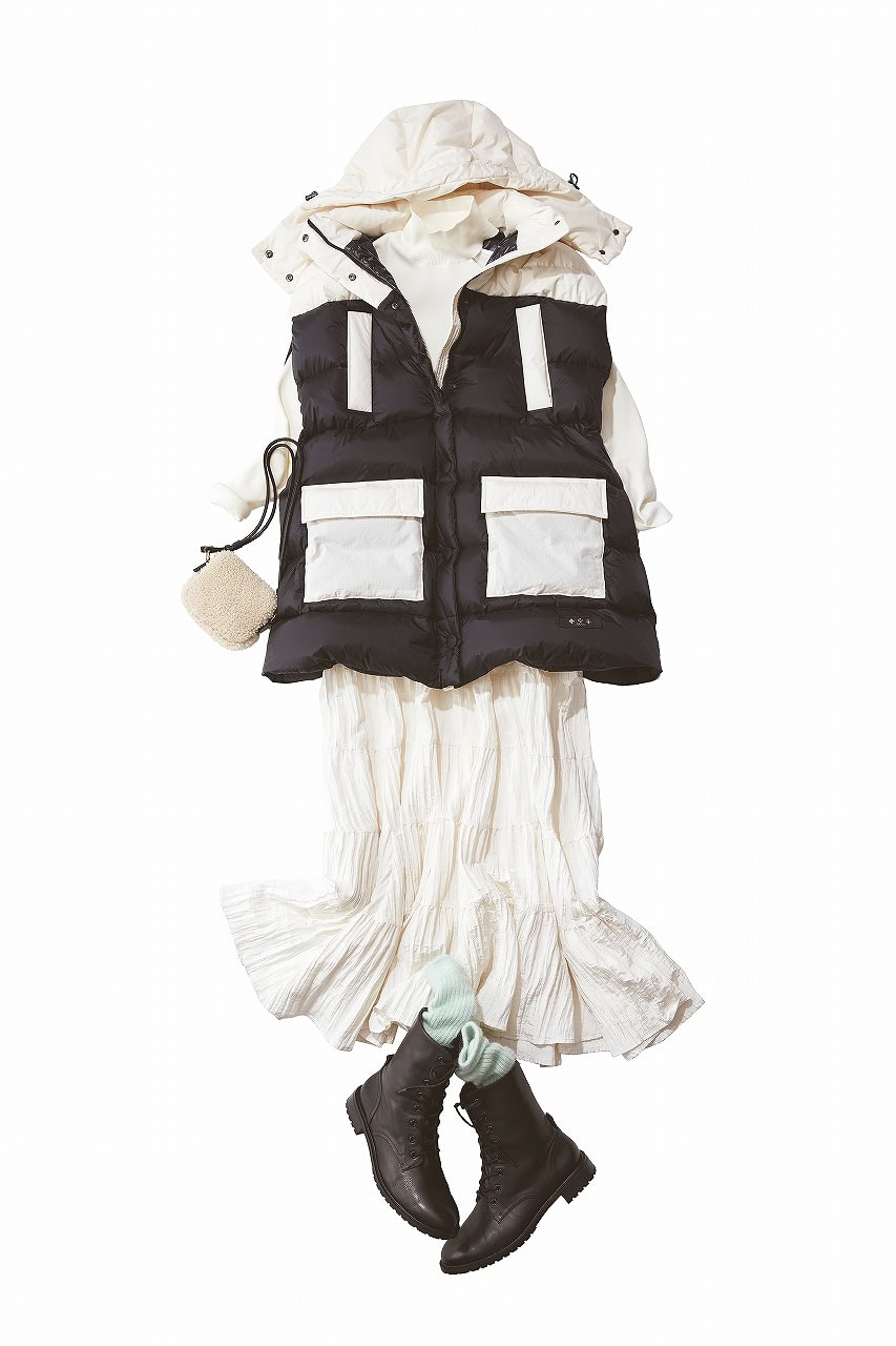 ホワイトダウンコート¥97,900(ケープホーン/ティースクエア プレスルーム)ニット¥42,900(サクラ/インターリブ)スカート¥79,200(ADORE/ADORE 六本木ヒルズ店)バッグ¥79,200(ストラスベリー)ブーツ¥46,200(ピッピシック/ユナイテッドアローズ 六本木ヒルズ店)