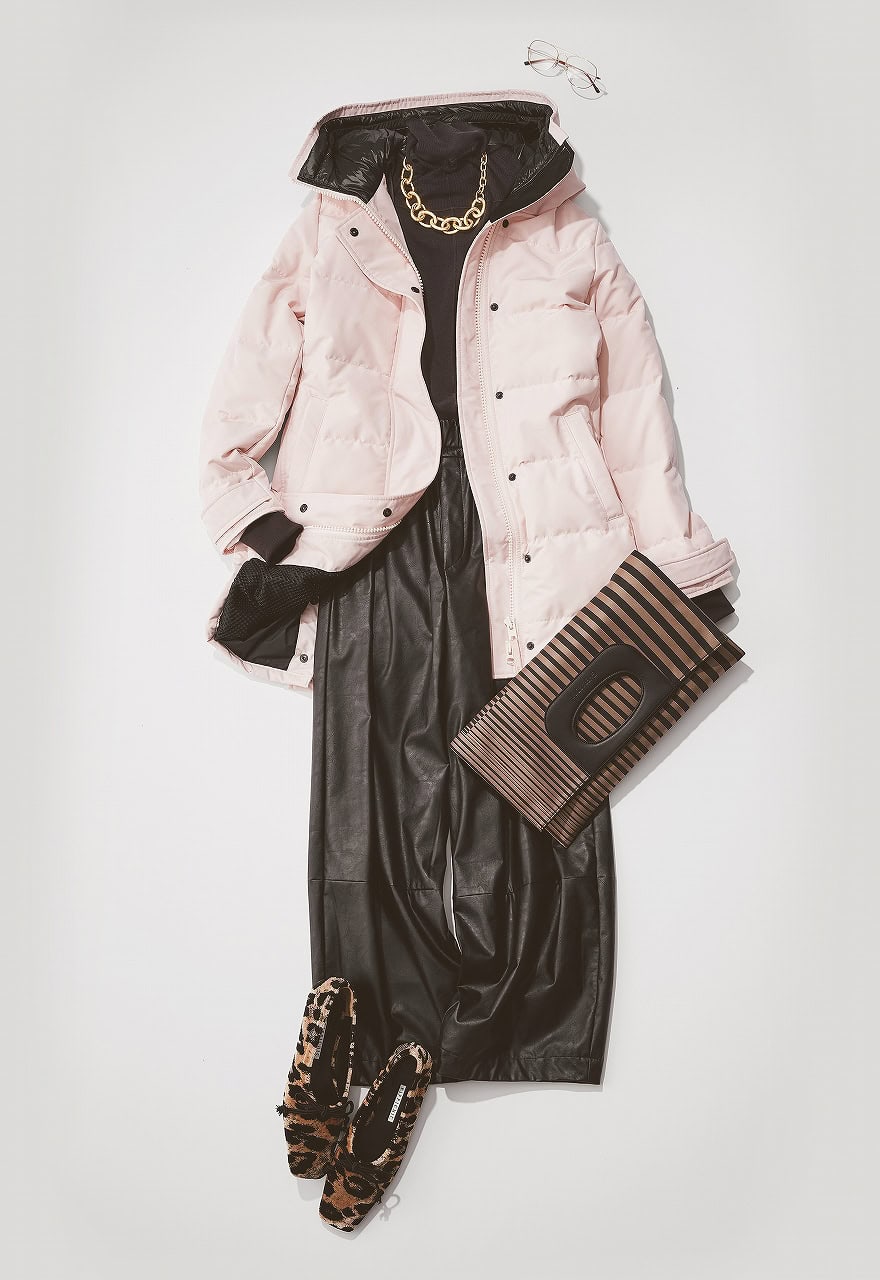 目を引くピンクダウンは冬の気分を一気に上げてくれる存在。キャッチーな小物やレザーアイテムを組み合わせれば、甘さを中和してモードスタイルに。オンリーワンの存在感で街でも映える一着です。