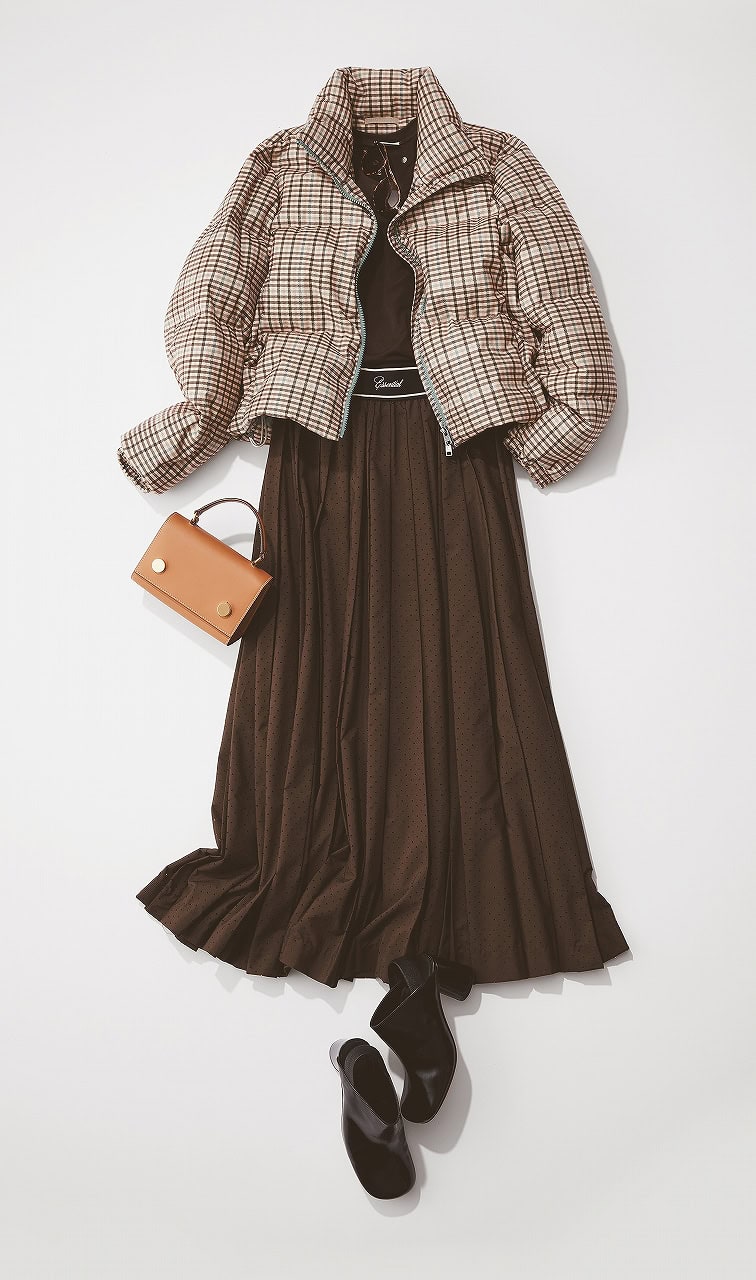 ブラウンダウンジャケット[撥水]¥26,990(TAION×UNFILO/アンフィーロ)トップス¥17,600(スタニングルアー/スタニングルアー 新宿店)リブニットタイトスカート¥27,500(LE PHIL/LE PHIL NEWoMan 新宿店)バッグ¥42,900(PUNTI./エルディスト ショールーム)パンプス¥40,700(プリティ・バレリーナ/F.E.N.)