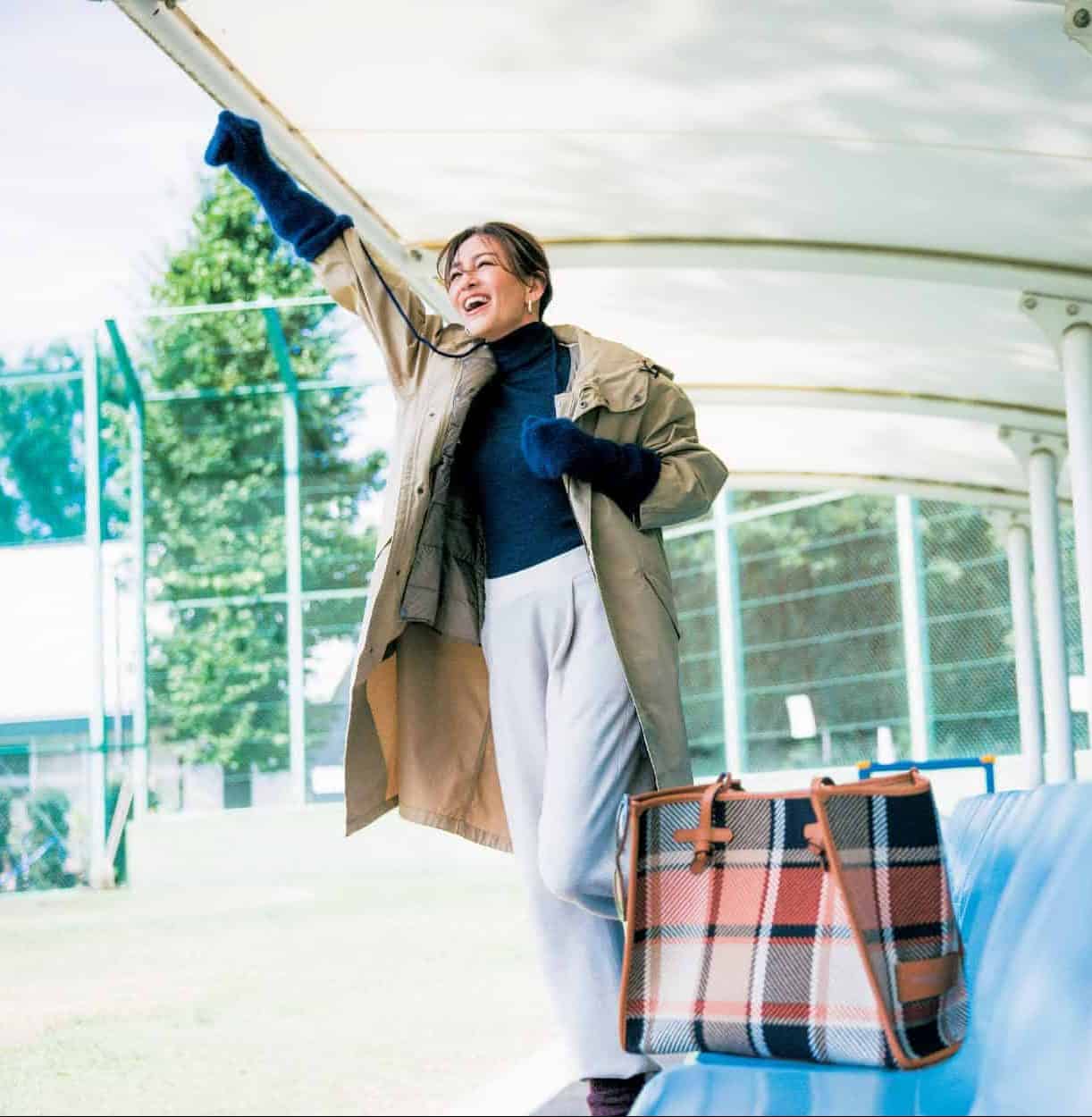 チェック柄ダウンジャケット¥104,500(ウールリッチ/ウールリッチ 二子玉川店)サーマルカットソー¥22,000(ヒステリックグラマー)パンツ¥39,600(ベイジ,/オンワード樫山 お客様相談室)バッグ[別注カラー]¥71,500(HEREU/ebure/リトルリーグ インク)スニーカー¥29,700(ノーネーム/ストックマン)