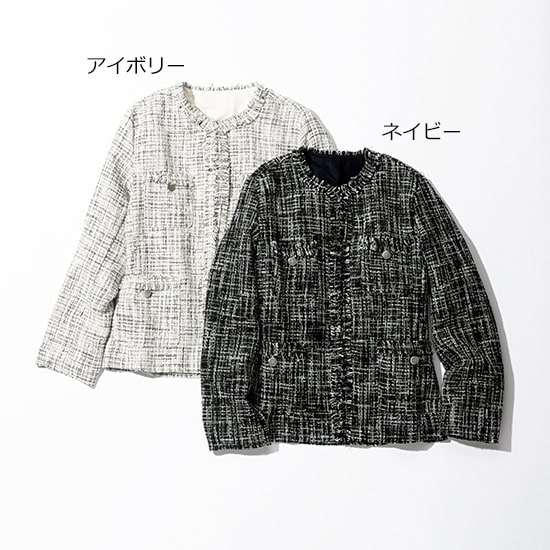 ツイード調のノーカラージャケットは、仕事、ママ友とランチなど幅広いシーンで活躍。デイリーに使いやすいシンプルなデザインが魅力です。フリンジデザインが、ほんのりカジュアルさを演出してくれます。
