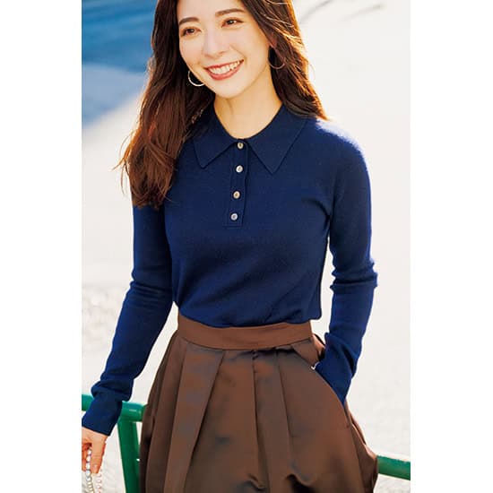 きちんと見えするポロニットは、長めの袖が今年らしい1枚。軽い着心地としっとりとした上品な風合いに仕上がっています。ボディはベーシックで程度なゆとりがあり洗練された印象が叶います。タイトなシルエットなので、ふんわりスカートやタックパンツなどボリュームのあるボトムスと合わせたい。