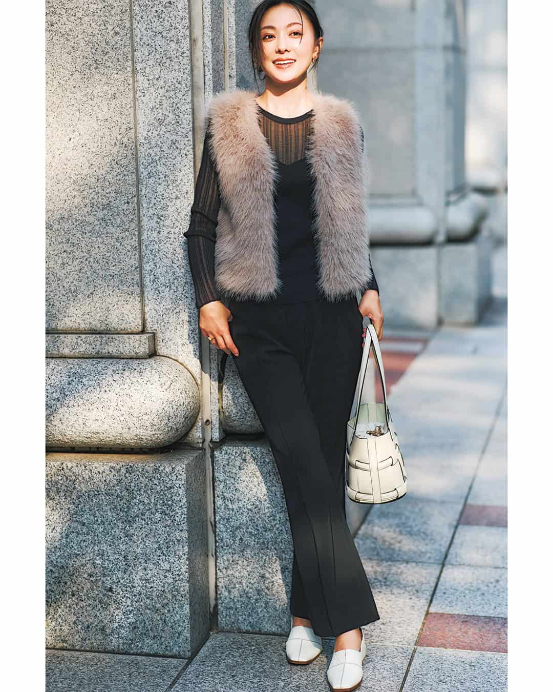 ジレ¥9,790(スパン)ニット¥18,920(アンクレイヴ/アンクレイヴ〈オンワード樫山〉)パンツ¥23,100(コエル/ビッグヒット)バッグ¥53,900(オルセット/オルサ)シューズ¥19,800(ル タロン グリーズ/ル タロン グリーズルミネ新宿店)ピアス¥61,600(モニス/フォーティーン ショールーム)リング¥73,700(マリハ)