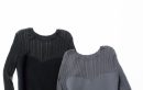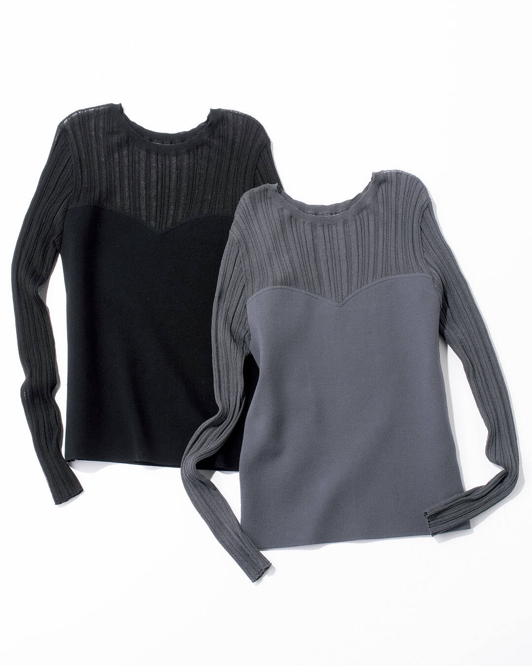 シアートップスにニットビスチェをレイヤードしているようなドッキングデザイン。身頃部分はしっかり伸縮性があり、程よく肉厚なので体のラインを拾いにくい。