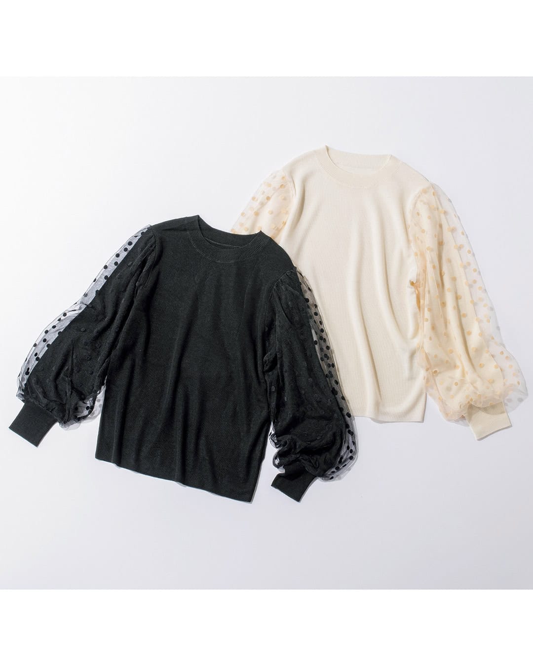 袖にミニドット柄のチュールを重ねたニットは、やりすぎていない甘さが大人に丁度いい。モックネックとコンパクトなボディが上品でコーデを高見えへと導きます。