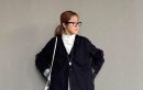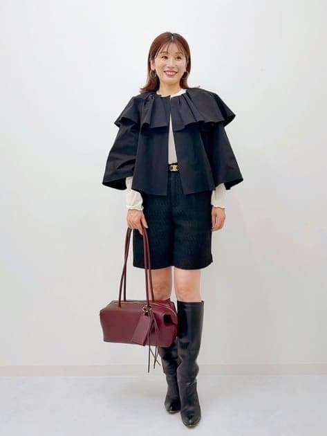 フロントの上部にホックが付いているので、羽織りのようにもブラウスのようにも着られる1枚。タートルネックを重ねてあえてレイヤードを楽しむのもオススメ。モデルの徳澤さんは前を全部閉めてブラウス風に着用。