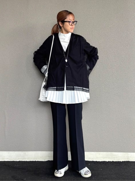 チュールジャケット¥20,900(シークレット・トロフィー)ロゴTシャツ¥9,790(アルページュストーリー)パンツ¥23,100(マイストラーダ)バッグ¥14,300(ツル バイ マリコ オイカワ)ピアス¥4,290(ieLS/ロードス)ネックレス¥30,800(ココシュニックオンキッチュ/ココシュニック)