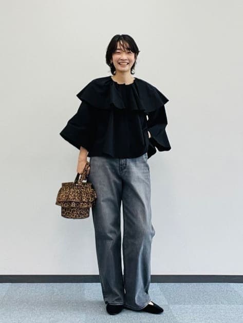 ジャケット¥15,400(PICCIN PERLA)ブラウス¥20,000(シーニュ)バッグ¥18,700(マニプリ)ピアス¥27,500(ニナ・エ・ジュール/ショールーム ロイト)バングル¥22,000(ワンエーアールバイウノアエレ/ウノアエレ ジャパン)リング¥22,000(ココシュニック オンキッチュ/ココシュニック)パンツ/スタイリスト私物