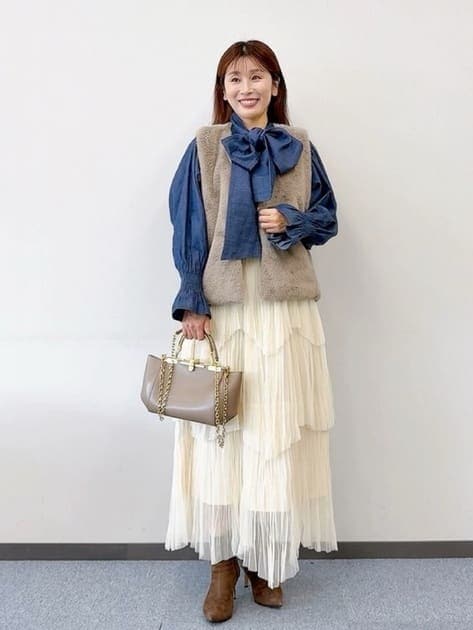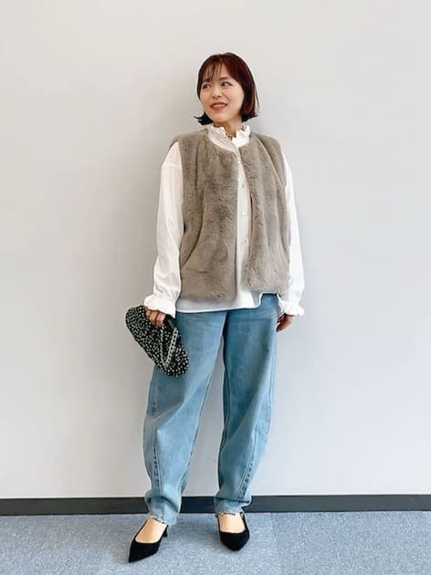 毛足の短いファージレはカジュアル感がありデイリー使いに最適。バックはコクーンシルエットになっており、360度どこから見てもサマになるデザイン。モデルの徳澤さんはデニムブラウス&白パンツと合わせて大人のハンサムコーデに。