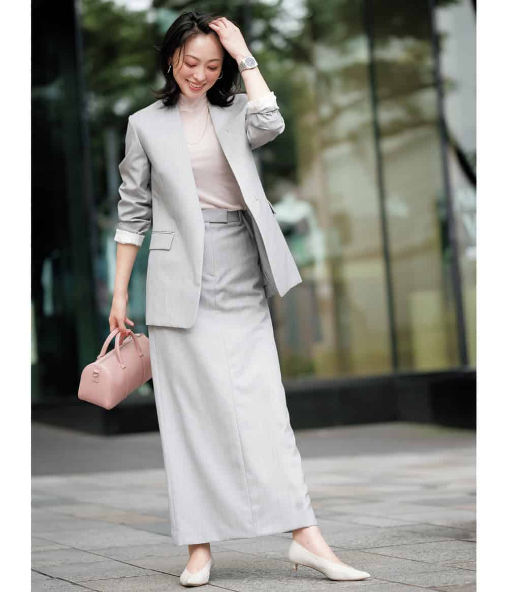 ほんのり疲れの残る休み明けはセットアップでお仕事モードに切り替えつつ、ニュアンスカラーで優しげなムードに着地。ロングスカートだからジャケパンよりもソフトに映って親しみやすい印象に。