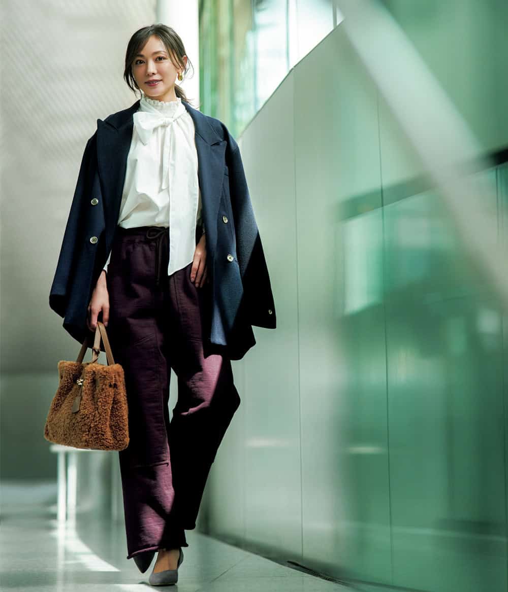 ジャケット¥86,240(テラ/ティースクエア プレスルーム)ブラウス¥28,600(エム マーリエ ル カセット/フランドルカスタマーサービス)パンツ¥36,300(フィル ザ ビル/フィル ザ ビル マーカンタイル)バッグ¥15,400(アルテミス by ダイアナ/アルテミス by ダイアナ アーバンドック ららぽーと豊洲店)パンプス¥18,150(ダイアナ/ダイアナ 銀座本店)ピアス¥25,300(エムシー・スタジオ/ズットホリック)