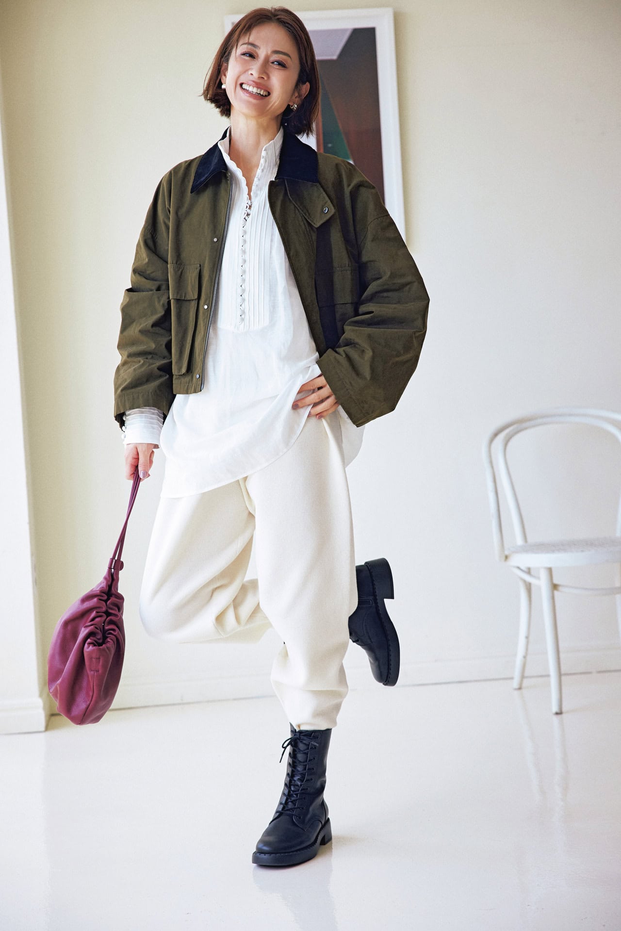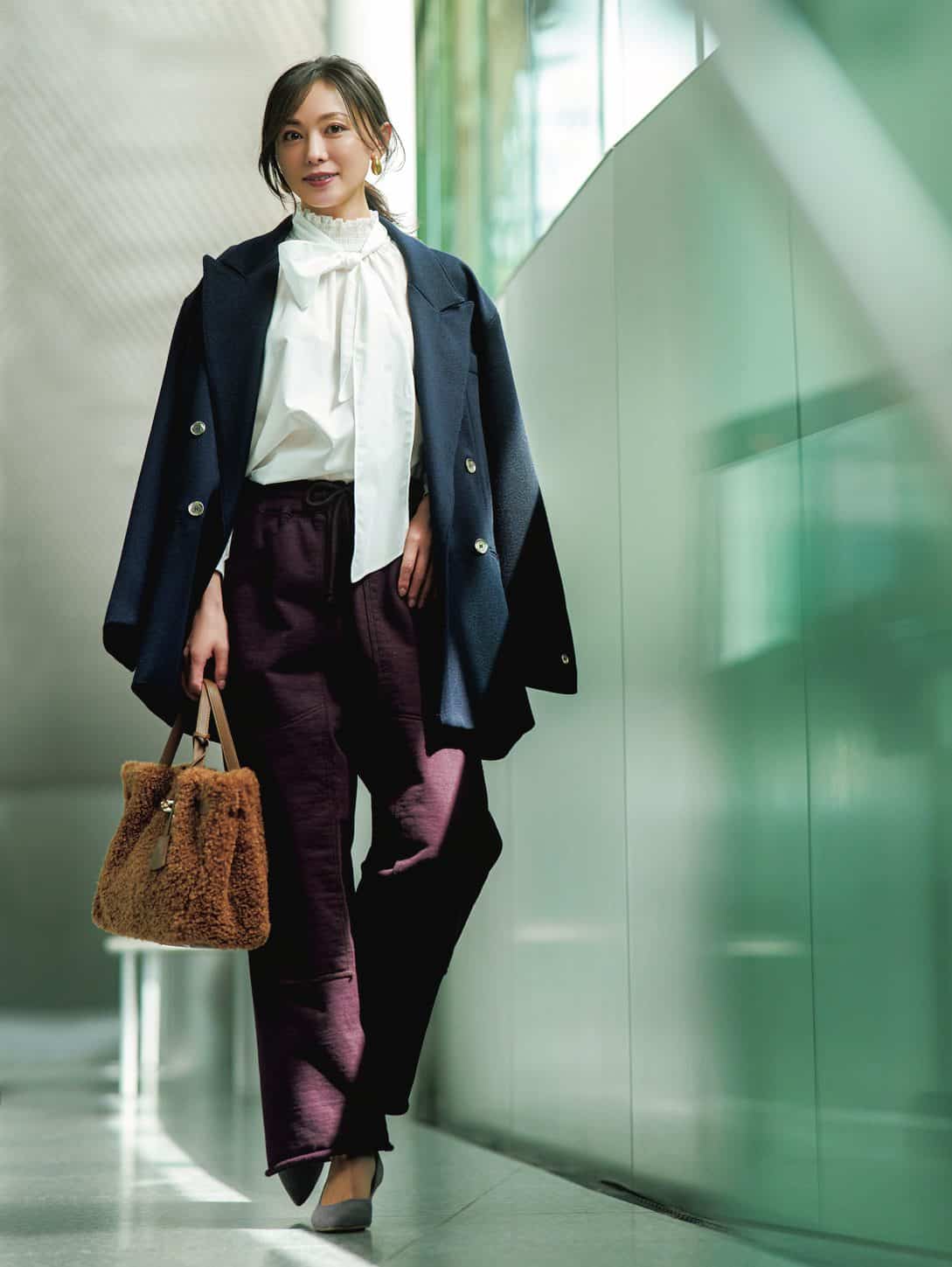 ニットパンツ¥9,900(ノーク)ジャケット¥86,900(サクラ/インターリブ)ブラウス¥33,000(カデュネ)バッグ¥33,000(ラシット/ラシット 京王百貨店新宿店)ブーツ¥60,500(ツル バイ マリコ オイカワ)ピアス¥20,900(シンパシー オブ ソウル スタイル/フラッパーズ)