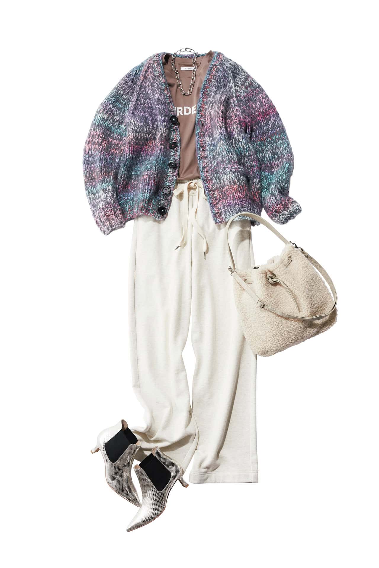 ラクチンながら美シルエットなホワイトのスウェットパンツ。ミックスニットにロゴTの合わせ技も、白なら上品に受け止めて、アイテム1つ1つの魅力を際立たせてくれます。ダボっとシェイプなカジュアルカーディガンも着映えアイテムにシフト。シルバーのブーツでシックな雰囲気に仕上げて。