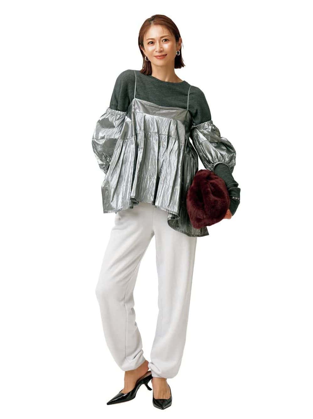 スウェットパンツ¥39,600(GALERIE VIE/GALERIE VIE Marunouchi)ブラウス¥19,800(メゾンスペシャル/メゾンスペシャル 青山店)カットソー¥27,500(サクラ/インターリブ)バッグ¥14,300(ダイアナ/ダイアナ 銀座本店)ミュール¥72,600(ペリーコ/アマン)ピアス¥15,400(ワンエーアールバイウノアエレ/ウノアエレ ジャパン)バングル¥7,560(アビステ)