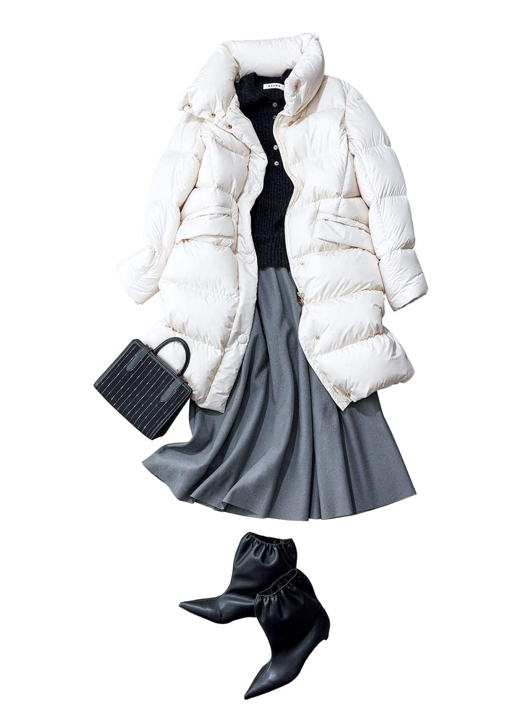 ホワイトダウンコート¥97,900(ケープホーン/ティースクエア プレスルーム)ニット¥42,900(サクラ/インターリブ)スカート¥79,200(ADORE/ADORE 六本木ヒルズ店)バッグ¥79,200(ストラスベリー)ブーツ¥46,200(ピッピシック/ユナイテッドアローズ 六本木ヒルズ店)