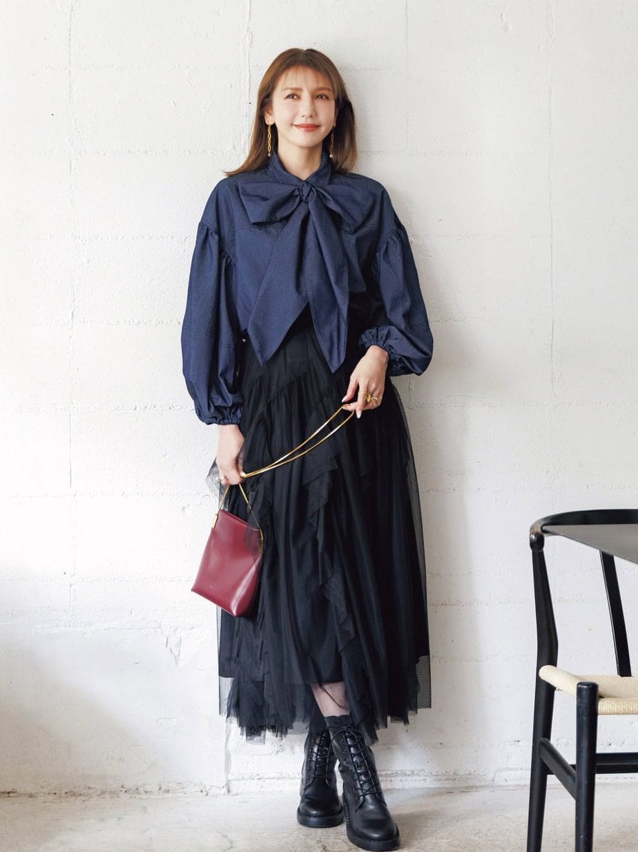 リボンデニムブラウス¥18,700(シークレット・トロフィー)スカート¥24,200(アルページュストーリー)バッグ¥69,300(マエストソ/オブリオ)ブーツ¥60,500(ツル バイ マリコ オイカワ)ピアス¥7,700〈MU〉リング[左手人さし指・中指]¥3,520〈ヘンカ〉リング[左手薬指]¥27,500〈mysha〉リング[右手]¥31,900〈Pearl for Life〉(すべてロードス)