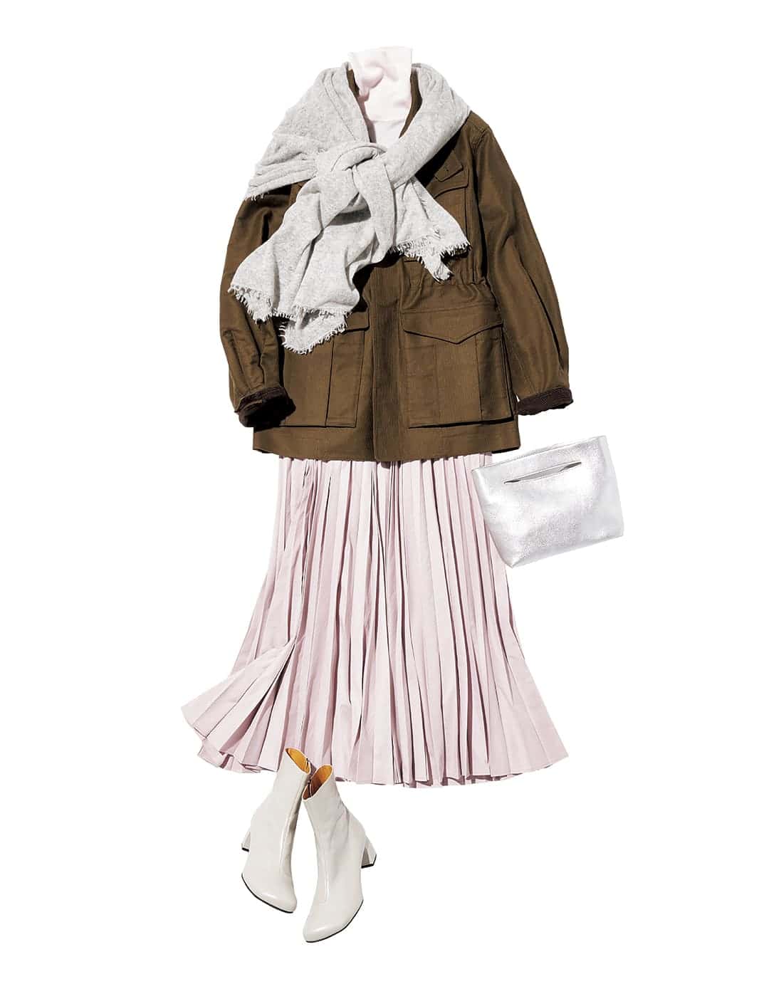 ミリタリージャケット¥89,100(カオス/カオス丸の内)ニット¥26,400(エイトン/エイトン青山)スカート¥27,940(23 区/オンワード樫山)ストール¥60,500(アルポ/アマン)バッグ¥64,900(MIUUR/ショールーム セッション)ブーツ¥80,300(カチム)