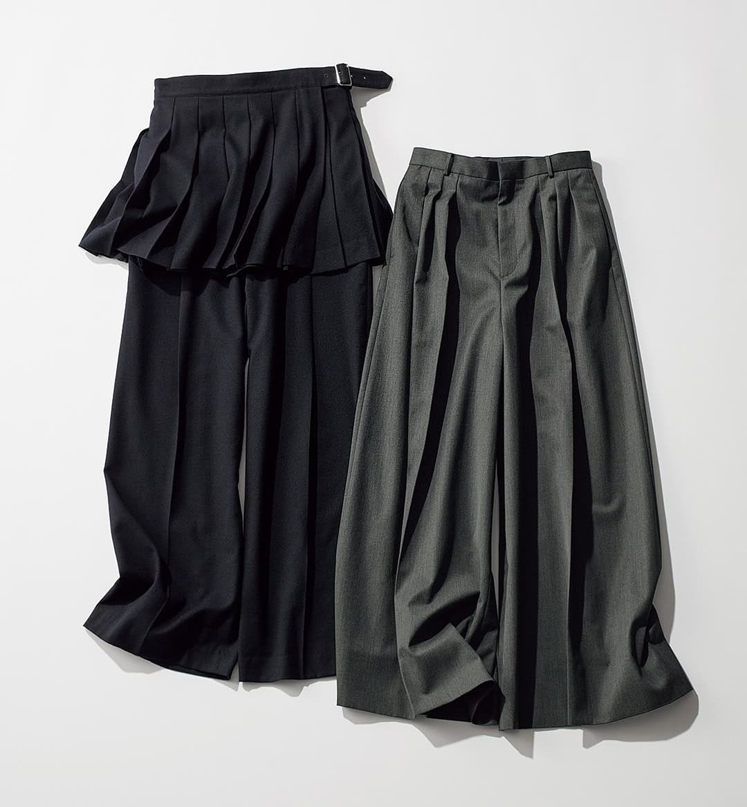 合わせたいのは、薄手のタートルニットやシャツ。とにかく注目を、ボトムスに集めるのが正解です。〈右〉パンツ¥59,400(エイトン/エイトン青山)〈左〉パンツ¥64,900ミニスカート¥53,900(ともにアンスクリア/アマン)