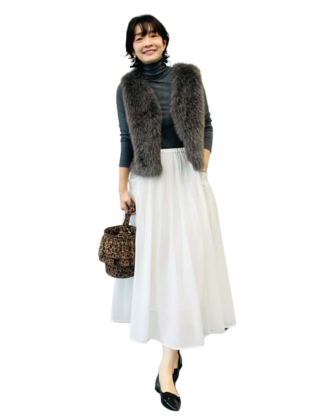 ①「華やかジレ」でシンプルコーデが脱・地味見え!