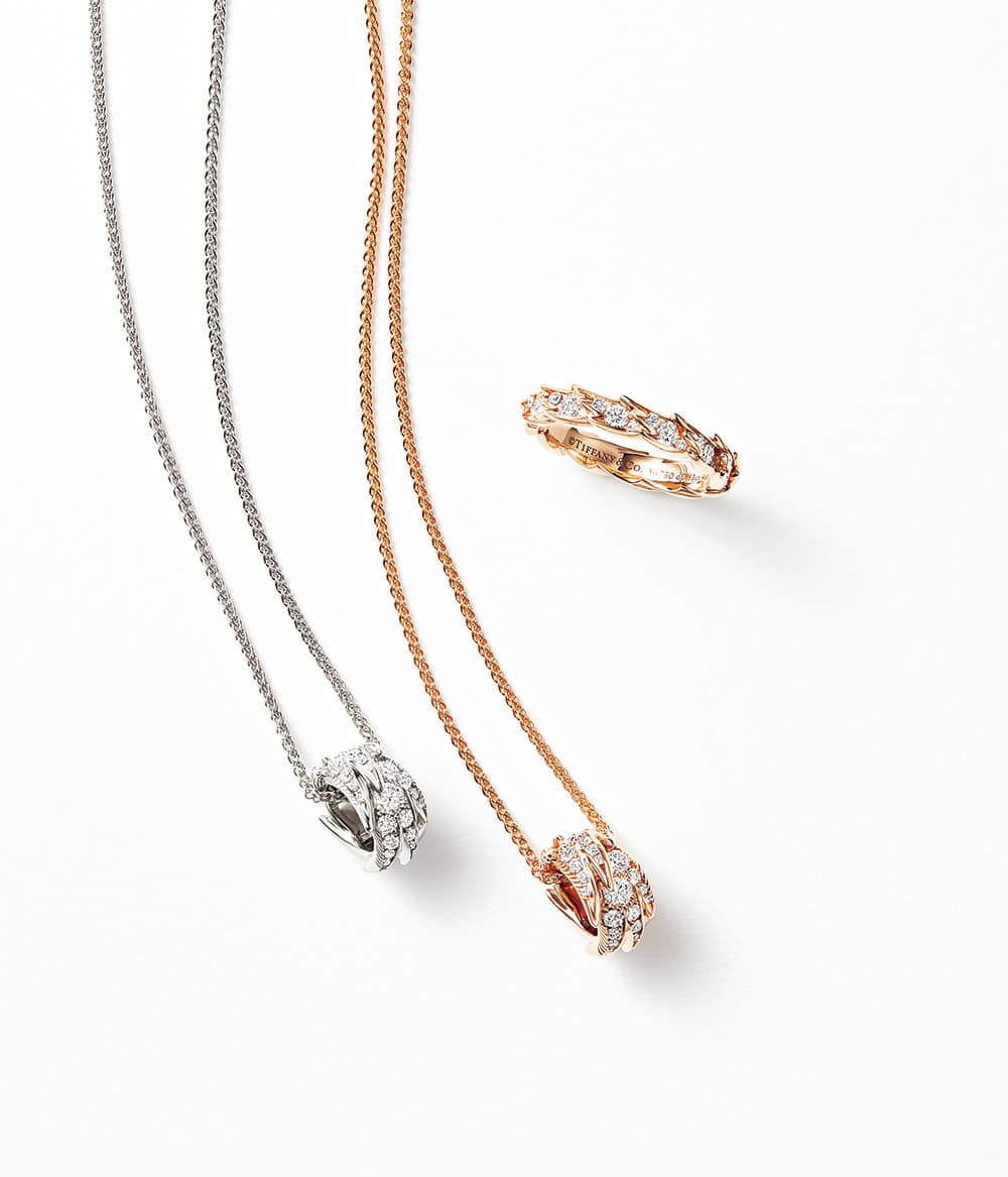 右上から時計回りに・「バード オン ア ロック」リング〈RG×DIA〉¥1,287,000ペンダント〈RG×DIA〉¥1,094,500ペンダント〈PT×DIA〉¥1,144,000(すべてティファニー/ティファニー・アンド・カンパニー・ジャパン・インク)