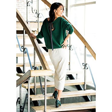 スカート¥6,589(ユアーズ)ニット¥6,990(アンフィーロ〈オンワード樫山 お客様相談室〉)ジャケット¥41,800(スタニングルアー/スタニングルアー 新宿店)シューズ¥35,200(ファビオ ルスコーニ/伊勢丹新宿本店 本館2階 婦人靴)ピアス¥19,800リング¥19,800(ともにプラウ)