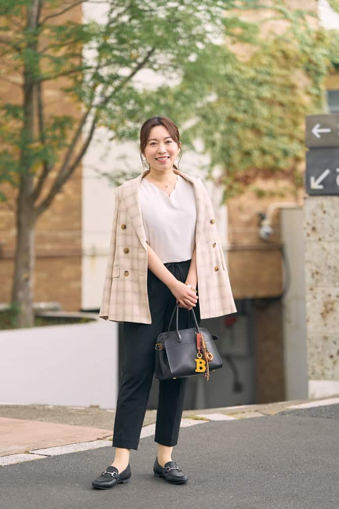 好奇心旺盛で、行動力には自信がある根っからの運動家タイプ。トレンド好きでミーハーな一面もありますが、着回しもしっかり考えて服を選ぶようにしています。仕事柄ジャケットを着用することが多いのですが、シンプルすぎるものよりも少し華やかな色やデザイン性のあるものを選ぶと、プライベートでも使えて重宝します。シンプルな仕事バッグは、チャームを付けるだけでトレンド感をプラスできるので、仕事帰りの女子会にもぴったりです。