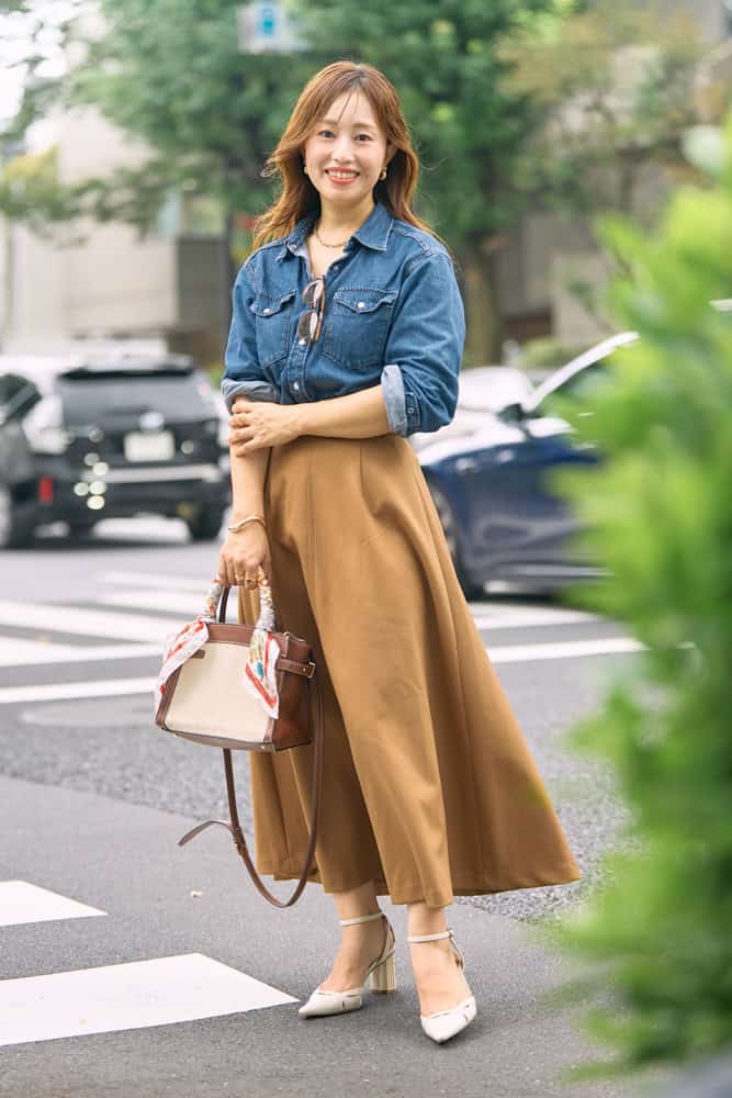 ワクワクの源は、シーズンごとのトレンドチェック。一目で心踊るときめきアイテムは、コーデに即取り入れたい派です。この秋はやっぱりブラウンが着たい!ということで、キャメルブラウンのAラインスカートにインディゴブルーのデニムシャツを合わせました。カジュアルになりがちなデニムシャツは深みのあるカラーでぐっと大人っぽく。明るい色味の小物で華やかさをプラスし、バッグにはスカーフを巻いて遊び心も忘れずに!