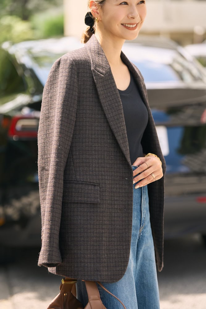 親しみやすさや安定感を重視する領事タイプなので、普段からデニムが定番。秋のおでかけには、デニムで自分らしさを保ちつつ、トレンド要素で華を添えた「運動家コーデ」にチャレンジしました。おでかけ気分を高めたい日は、いつものデニムにトレンドのチェックジャケットを羽織り、小物はブラウンで統一して上品になじませます。