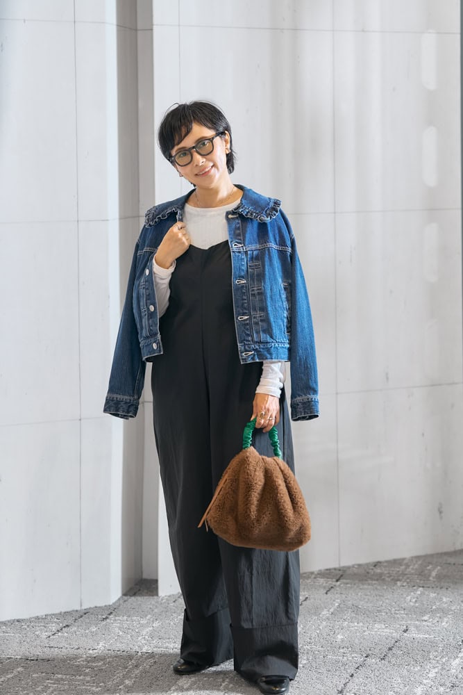 裾の太め折り返しがお気に入りのmeyameのひとくせサロペに、フリル襟が印象的な甘Gジャンを重ねて華やかに。眼鏡とローファーでマニッシュ感をプラスすれば、甘さと知的さを兼ね備えた”甘ニッシュ”な着こなしにアップデート。好奇心旺盛で自由な運動家タイプにぴったりのコーデです。指輪や小物でさりげなく遊び心を効かせ、シンプルコーデを今っぽく仕上げれば、シーンを選ばず自然体で映えるスタイルに。