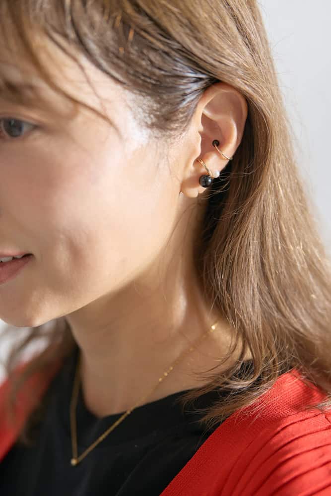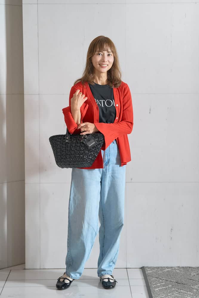 PATOUの黒T×デニムの軽快カジュアルに、今季気になる赤のペプラムカーデを合わせて旬のコーデにアップデート。シンプルな装いに鮮やかな赤を差し込むことで、一気に華やぎモードに。ママ友とのランチやお茶はもちろん、大好きなライブや推し活にも映える、社交的でアクティブな運動家タイプらしさ満載のコーデです。耳元には少しずつ集めているHirotakaのイヤカフを重ね、動きやすさの中に上品な遊び心をプラス。