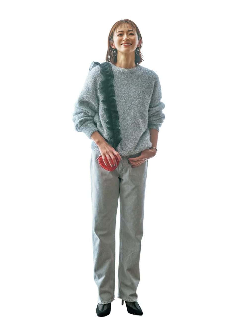 爽快なライトカラー×キラキラと輝くグリッターは、冬らしく甘さたっぷり。季節感が伝わるデザインなので、着ているだけで高揚感が高まります。甘ニットは、同色デニムなどほんのり抜け感の出せるアイテムを合わせたい。