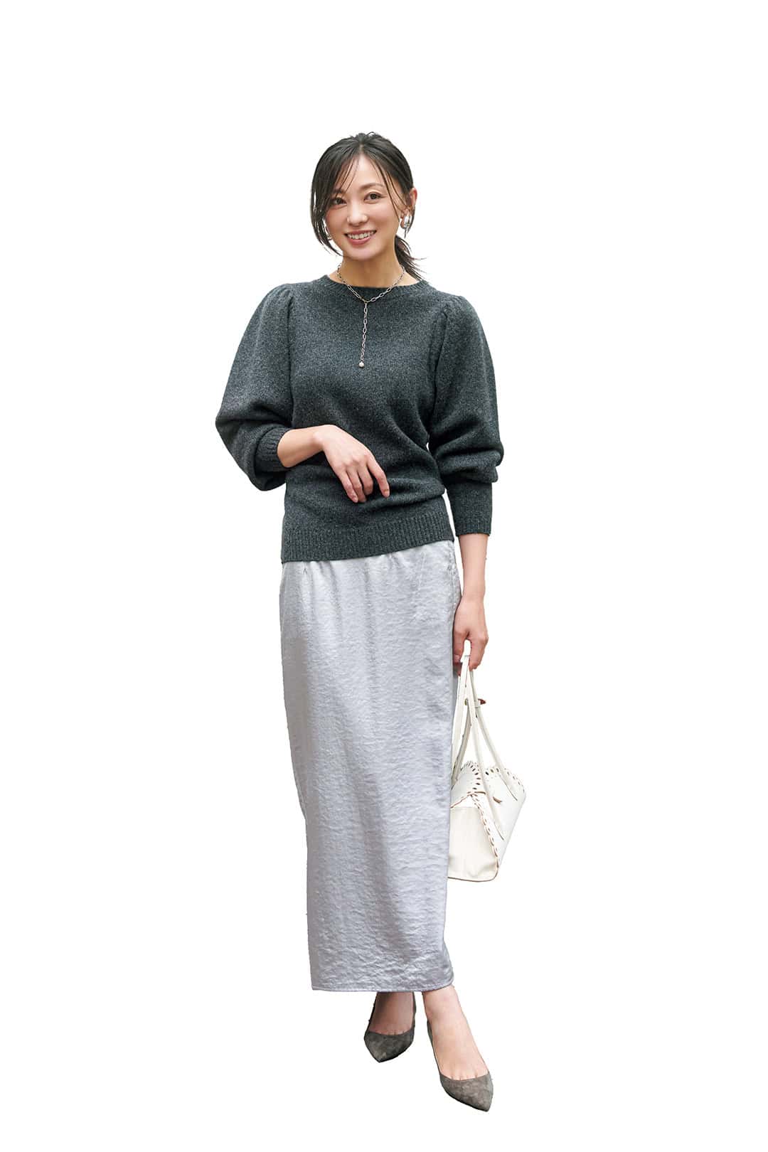 ニット¥37,400(プロタゴニスタ/アマン)スカート[ラップ付き]¥22,000(ストラ)バッグ¥47,300(メアリ オル ターナ/AL Design Inc.)パンプス¥64,900(ネブローニ)ピアス¥3,900〈soie〉ネックレス¥13,750〈ポピー・ケー〉(ともにロードス)