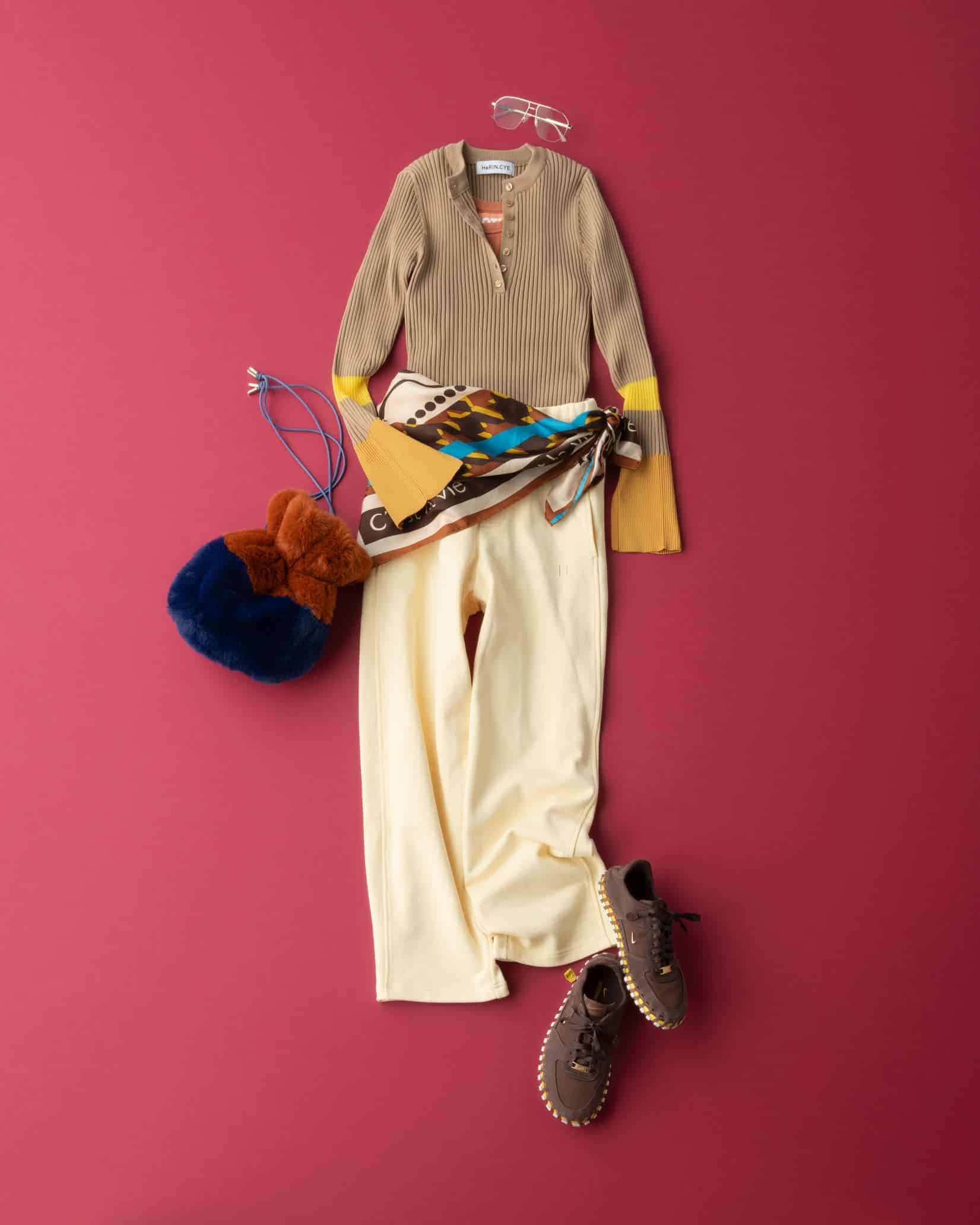 こちらのニットと出会った時、この合わせで着たい!と思って一緒にオーダーしたパンツです。袖のイエローをスカーフの柄やスニーカーでもリフレインしてポイントに。カジュアルでラクチンなスタイルですが手抜きに見えないよう小物で遊びを加え、旅のワクワク感を表現してみました。