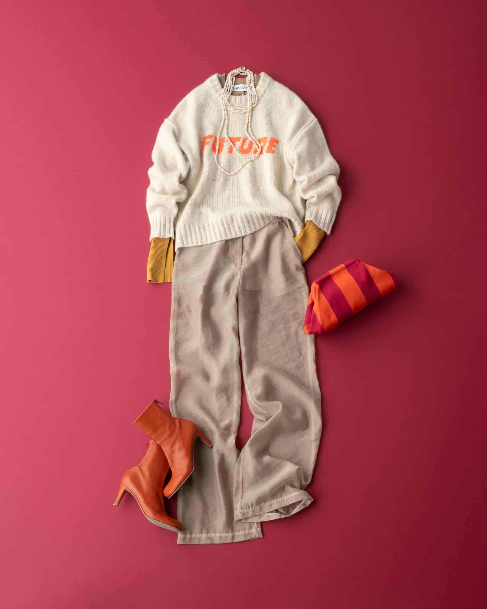 ニットの袖のカラーを使ったレイヤードがポイント。カシミア素材のロゴニットを重ねてカジュアルにした分、シアーパンツの透け感とじゃら付けパールネックレスで華やかなお出掛けムードを演出しました。ショートブーツとバッグの色をロゴのオレンジと揃えて、遊びがありつつもまとまりのあるコーディネートに。