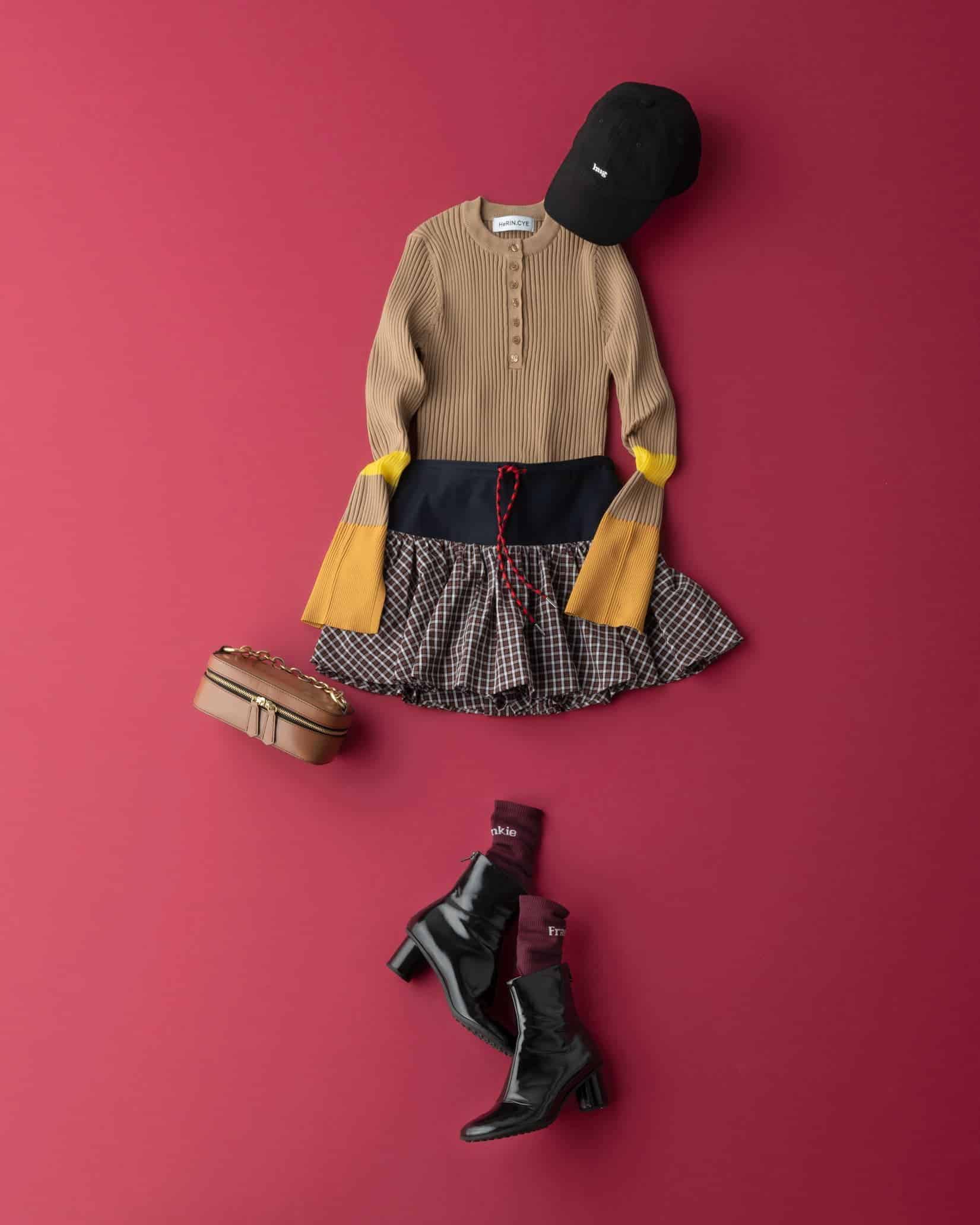 ニット(着回し)スカート(SANDRO)バッグ(ORSETTO)ショートブーツ(BOTTEGA VENETA)キャップ(HeRIN.CYE)ソックス(The Frankie Shop)(すべて本人私物)